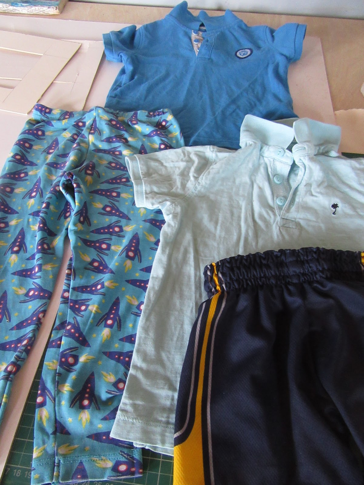 In my sewing cabin I have been going through a box of 2-3 year old toddler clothes left by one of my sons for recycling. Here are two polo shirts, a pair of pyjamas and some shorts. What to make?